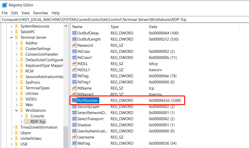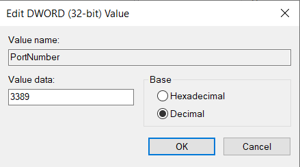 1.Open the registry and navigate to the following path: [HKEY_LOCAL_MACHINE\SYSTEM\CurrentControlSet\Control\Terminal Server\Wds\rdpwd\Tds\tcp], Do you see the PortNumber value? First, select decimal, its default value is 3389. Then, change it to your desired port number.