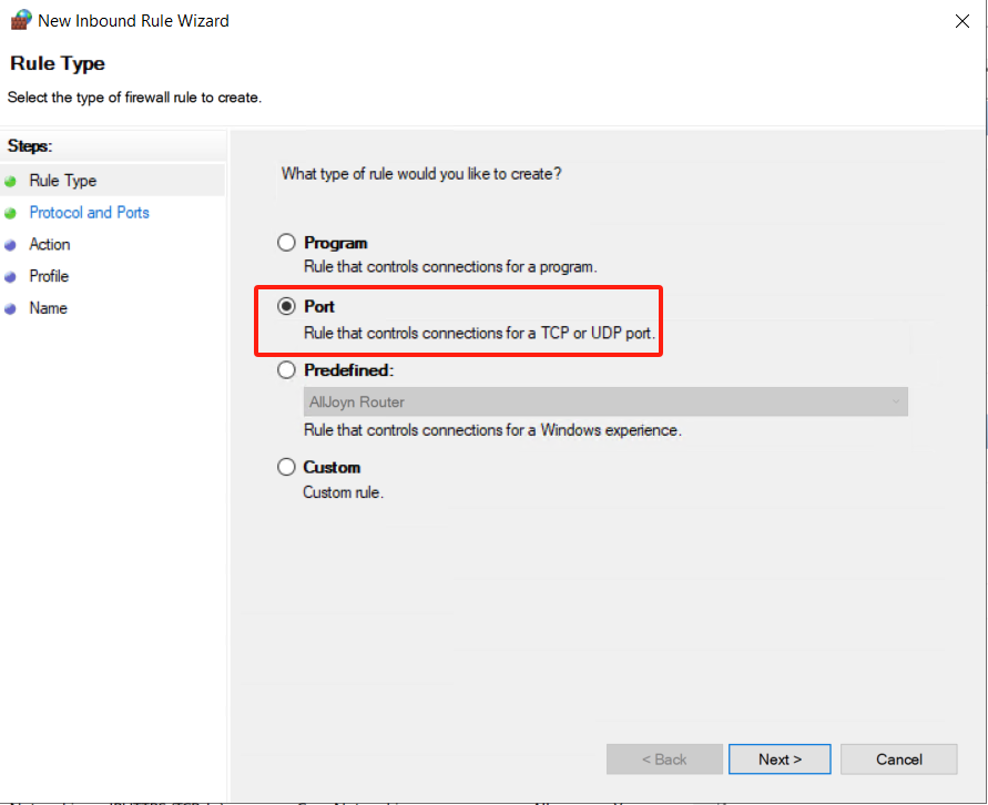 3.If the Windows Firewall is enabled, be sure to create a new rule in the firewall to add the respective port.
