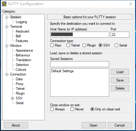On Windows, open the Putty software, enter the IP address and remote port (default 22), and press Enter.