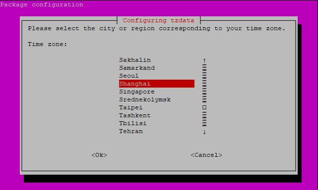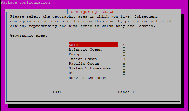 This command opens a graphical interface, navigated using the up and down arrow keys. To change the time zone to Beijing time, select “Asia” and confirm with Enter.