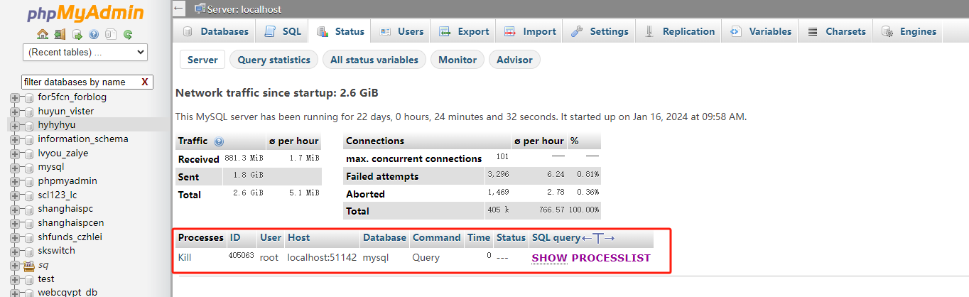 phpMyAdmin can also view the currently executed SQL statements. As shown below, after logging in, click "Status = ยป Process" to view.
