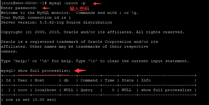 After remotely connecting to the cloud server, execute the following command. If it is a Windows operating system, it needs to switch to the bin directory under the mysql directory for execution.