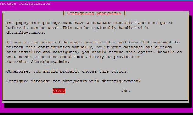 When asked about setting up the phpMyAdmin database, select "Yes" and press Enter to proceed.