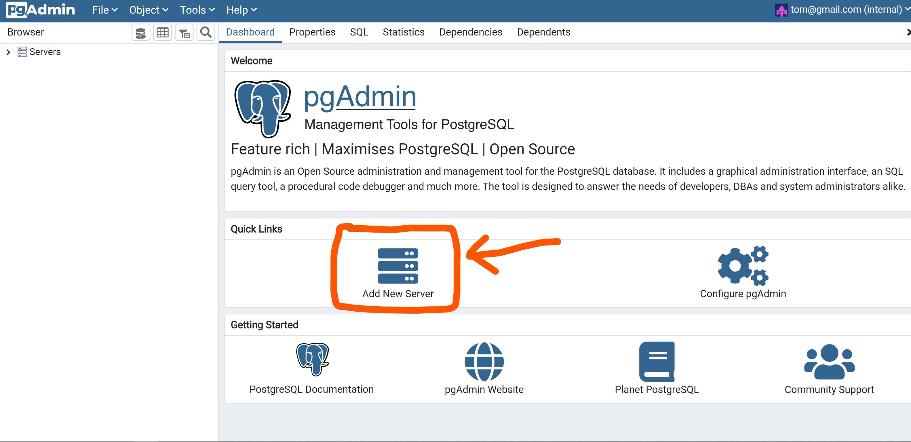 Log in to the pgAdmin management address, go to the Dashboard interface, and click on "Add New Server."
